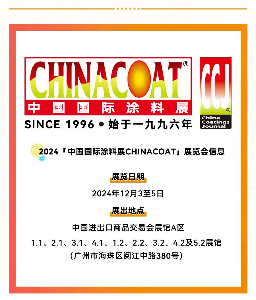 2024-12-02  |  文章(zhāng)來源:  |  點擊率: 中國國際塗料展 CHINACOAT是塗料業一年一度的行業盛會,展(zhǎn)出內容覆蓋整個塗料產業鏈(liàn)的產品和技術。