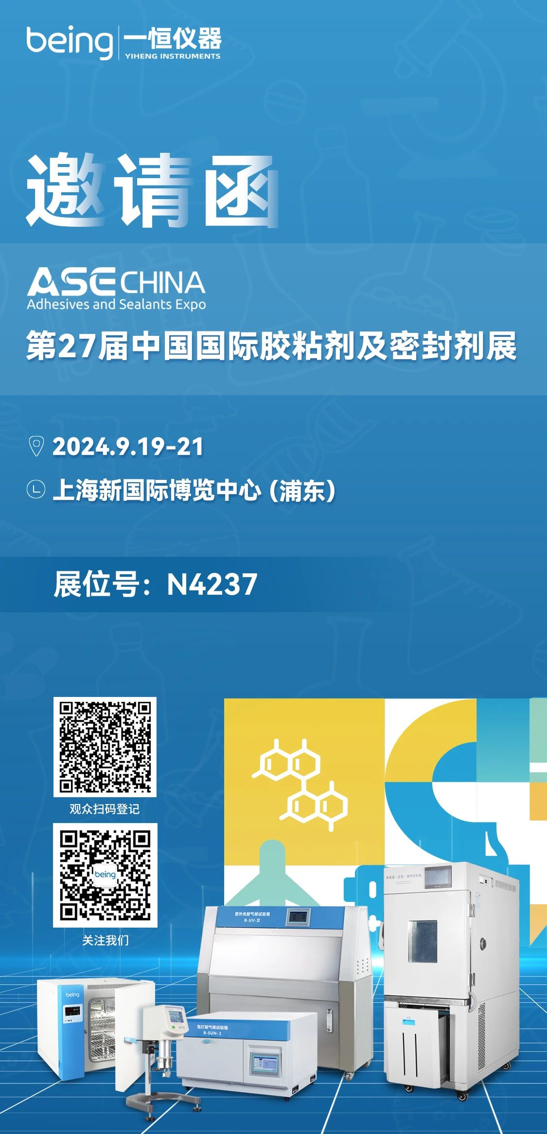 2024-09-13 | 文章來源: | 點擊率: 國際膠粘劑及密封劑展覽會(ASE CHINA)是(shì)以膠粘劑、密封劑、膠粘帶及薄膜為一體的專業展覽(lǎn)會已獲得UFI權威認證。第27屆國際膠粘劑及密封劑展將於(yú)2024年9月19-21日在上海新國際博(bó)覽中心舉辦。本次展覽會,我司將攜高低溫(交變)濕熱試驗箱、氙燈(dēng)耐氣候試(shì)驗箱、紫外光耐氣候試驗箱、鼓風(fēng)幹燥箱、均質分散機和(hé)新款粘度計(jì)等產品亮相N4237展台,期待您蒞臨現場,交流合作。