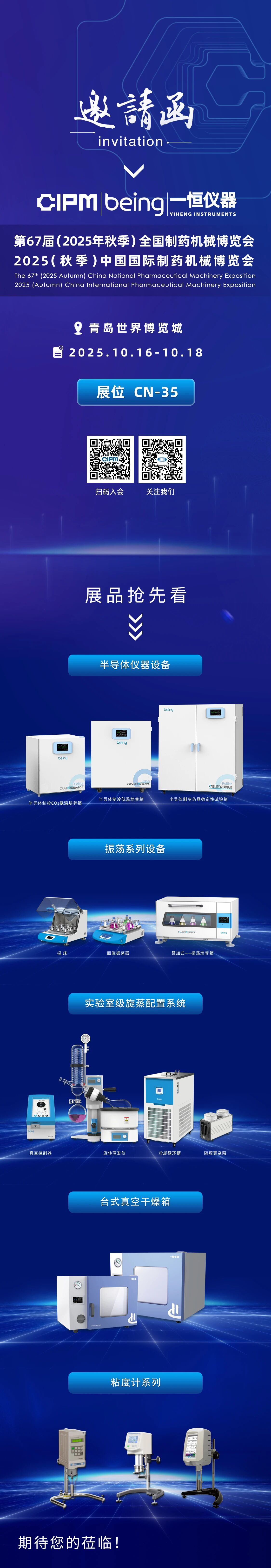2025-10-13 | 文章來源: | 點擊率: 2025年(nián)(秋季)中國國(guó)際(jì)製藥機械博(bó)覽會將於2025年(nián)10月16日在青島世界博覽城開幕,我們誠摯邀(yāo)請您蒞臨CN-35展位,共話合作新機遇。作為溫濕度控製解決方案的專(zhuān)業供(gòng)應商,我司將攜半導(dǎo)體製(zhì)冷係列設備、振蕩係列設備、實驗室旋轉(zhuǎn)蒸發儀配置係統、幹燥箱係(xì)列、新型粘度計與專業解決方案(àn)亮相展位CN-35。