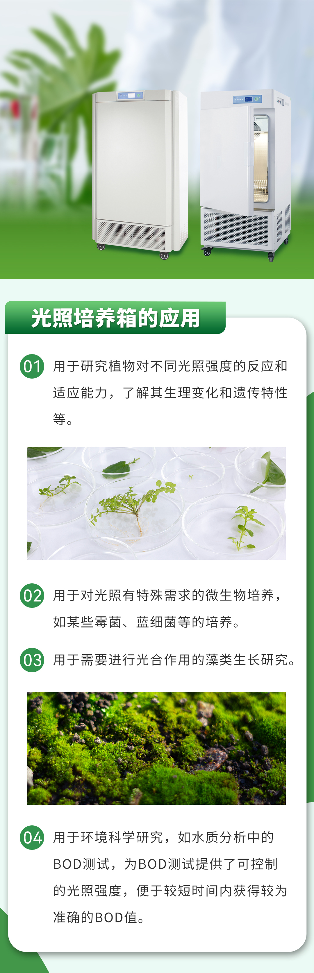 所以植(zhí)物培養箱和光照(zhào)培養箱因其功能側重點不(bú)同(tóng),應用領域也有所(suǒ)不同。
