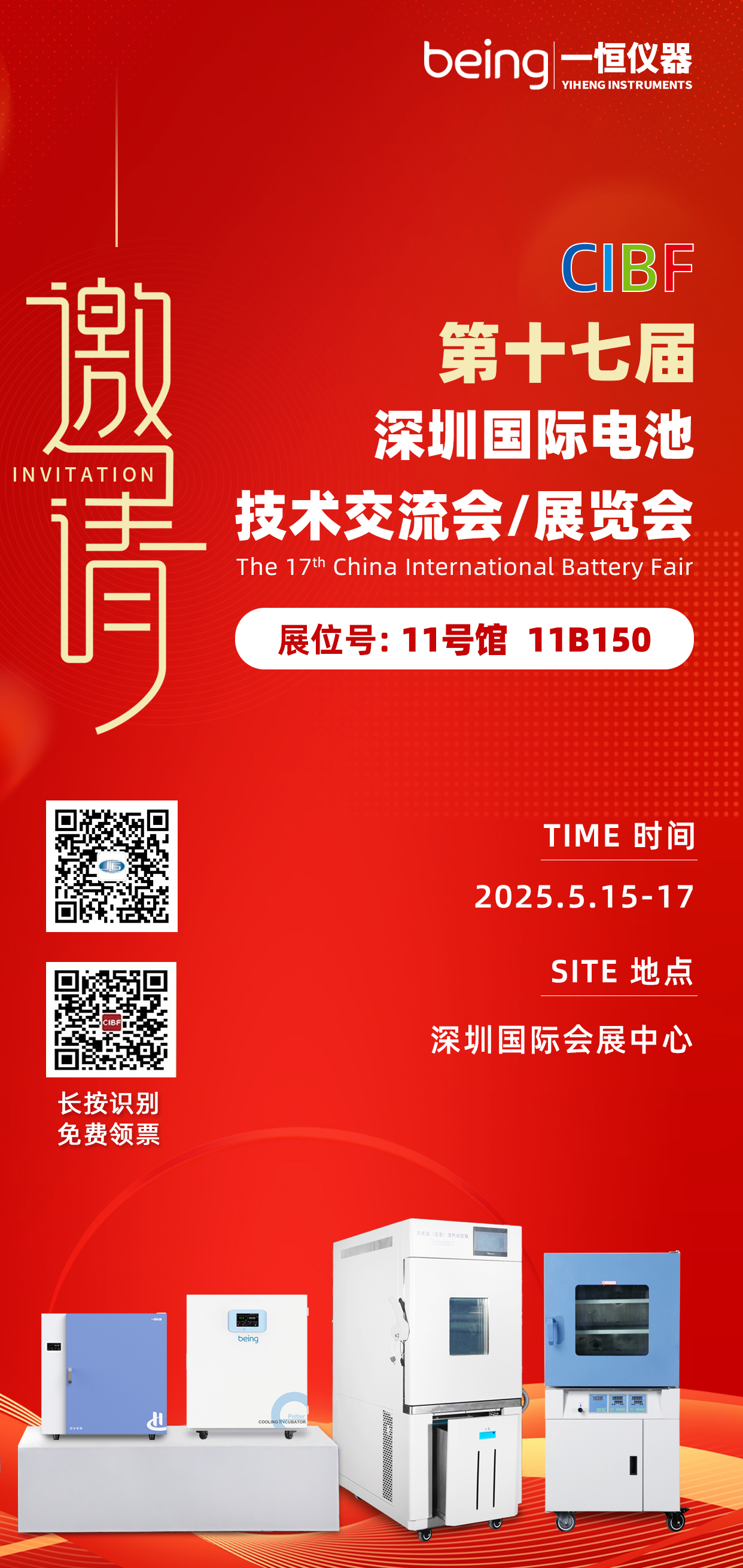 2025-05-08 | 文章來源: | 點擊率: 在全(quán)球能源(yuán)轉型步(bù)伐加快的背景下,第十七屆深圳國際電池技術交流會/展(zhǎn)覽會(CIBF2025)將於2025年5月15日至17日在深圳國際會展中心盛大(dà)開幕。一恒儀器將攜旗(qí)下真空幹燥箱、鼓風幹燥箱、高低溫試驗(yàn)箱、半導體低溫培養(yǎng)箱、隔膜泵等專(zhuān)業產品(pǐn)和技術解決方案,在11B150展位精彩亮相。
