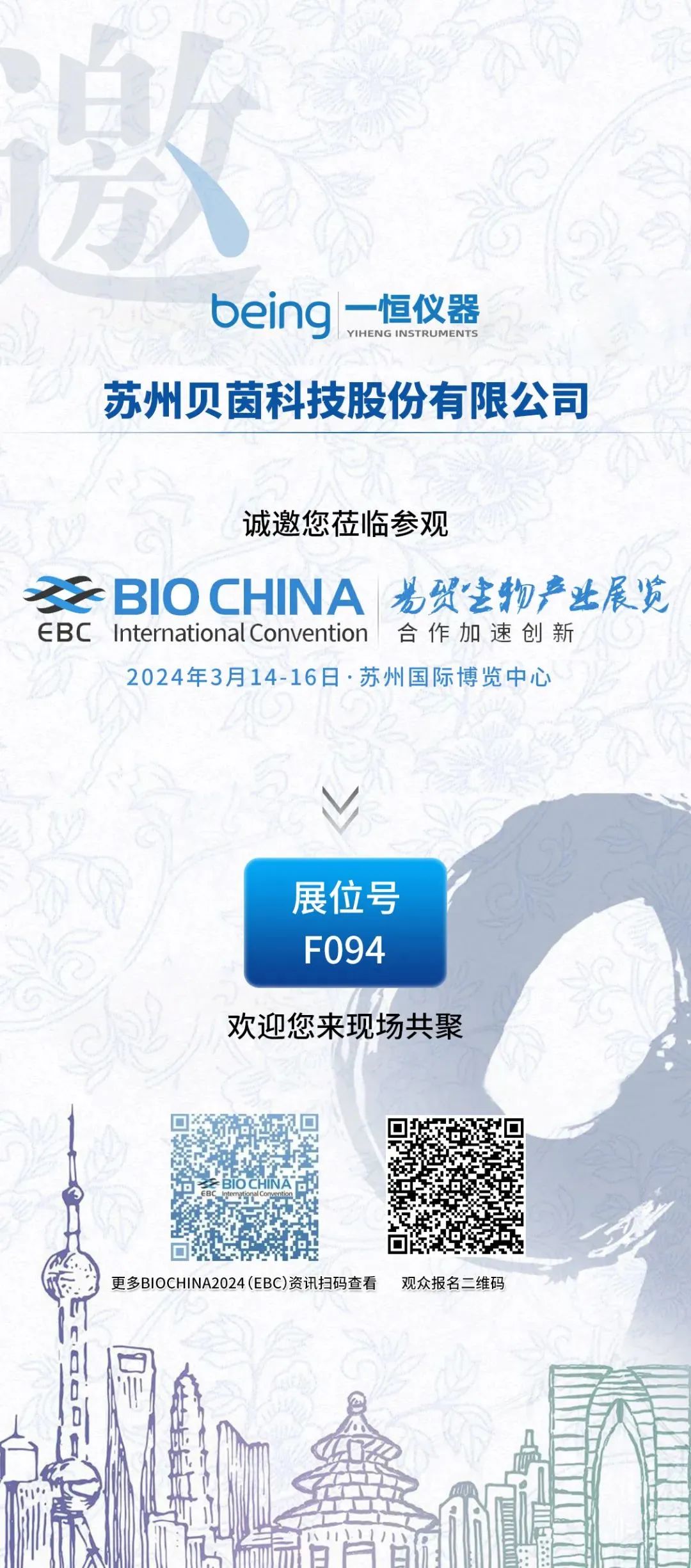 BIOCHINA2024(EBC)第九屆易貿生物產業大會暨易貿生物產業展覽將於2024年3月14-16日在蘇州國際博覽中心召開。貝茵科技將參(cān)加本(běn)次展(zhǎn)會,歡迎各位屆時前(qián)往F3館F094展(zhǎn)位交流垂詢。